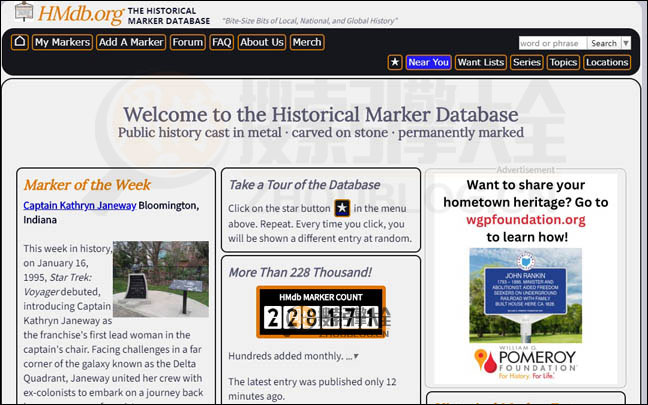 The Historical Marker Database历史遗址数据库,这是一个由志愿者经营的网站,网站里有志愿者们找出的世界8万多个历史遗址的地理坐标,其中大部分在美国。