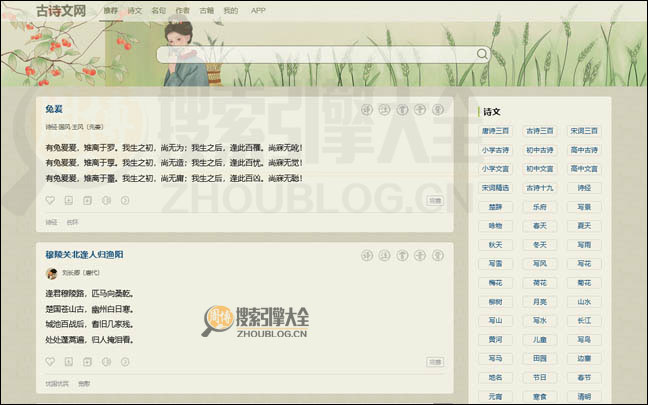 中文网站GuShiWen:古诗文资料网【中国】古诗文网作为传承经典的网站成立于2011年。古诗文网专注于古诗文服务,致力于让古诗文爱好者更便捷地发表及获取古诗文
